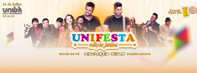 Quadrilha, comidas típicas, gente bonita, decoração temática e muito forró e sertanejo embalarão a primeira edição da UNIFESTA. No dia 16 de julho, sábado, a partir das 15h, o campus do UniBH Estoril (Av. Professor Mário Werneck, 1685 – Estoril) será palco para o sertanejo de Henrique & Diego e o forró dos grupos Bicho de Pé e Chama Chuva.