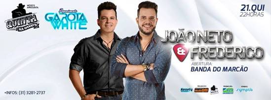 Referência em festas e baladas sertanejas na região metropolitana de Belo Horizonte, a Wood’s (Alameda da Serra, 154 – Vale do Sereno) será palco para um projeto inédito. A partir do dia 21 de julho, as noites de quinta-feira serão mais uma opção para curtir o melhor da música sertaneja. Na estreia do Quinta na Wood’s, a Wood’s, a Nenety Eventos e o empresário João Wellington promovem o show da dupla João Neto e Frederico. Ainda se apresentam a Banda do Marcão e o DJ Heldo, que aquecerão o público para o Garota White.