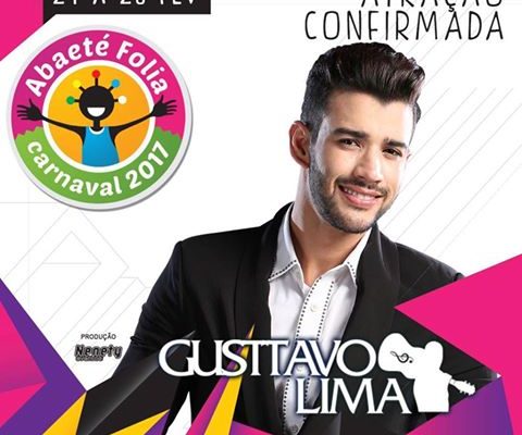Após anunciar a dupla  Zé Neto & Cristiano como a primeira atração do Abaeté Folia 2017, a Nenety Eventos acaba de confirmar mais um grande nome para o Melhor Carnaval de Minas: Gusttavo Lima. O evento, que chega à sua 11ª edição, será realizado de 24 a 28 de fevereiro em uma mega estrutura que será montada no Campo do Abaeté (Rua Dr. Antônio Amador, Nº120, Centro, Abaeté-MG).